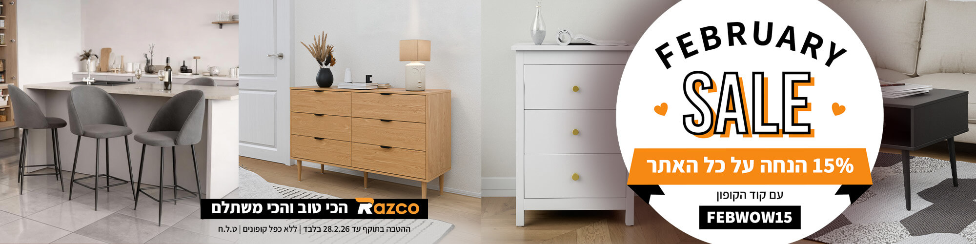 ברוכים הבאים לרזקו חנות רהיטים לבית! אנו מציעים לכם מגוון של רהיטים מעוצבים שישדרגו את חלל הבית שלכם. עם המחויבות שלנו למלאי גדול, זמני אספקה מהירים ולמחירים זולים בשוק והכל בחנות רהיטים אחת, תוכלו ליהנות מחוויית קניה נוחה וקלה והבחירה בנו תהיה לעסקה המשתלמת ביותר עבורכם!