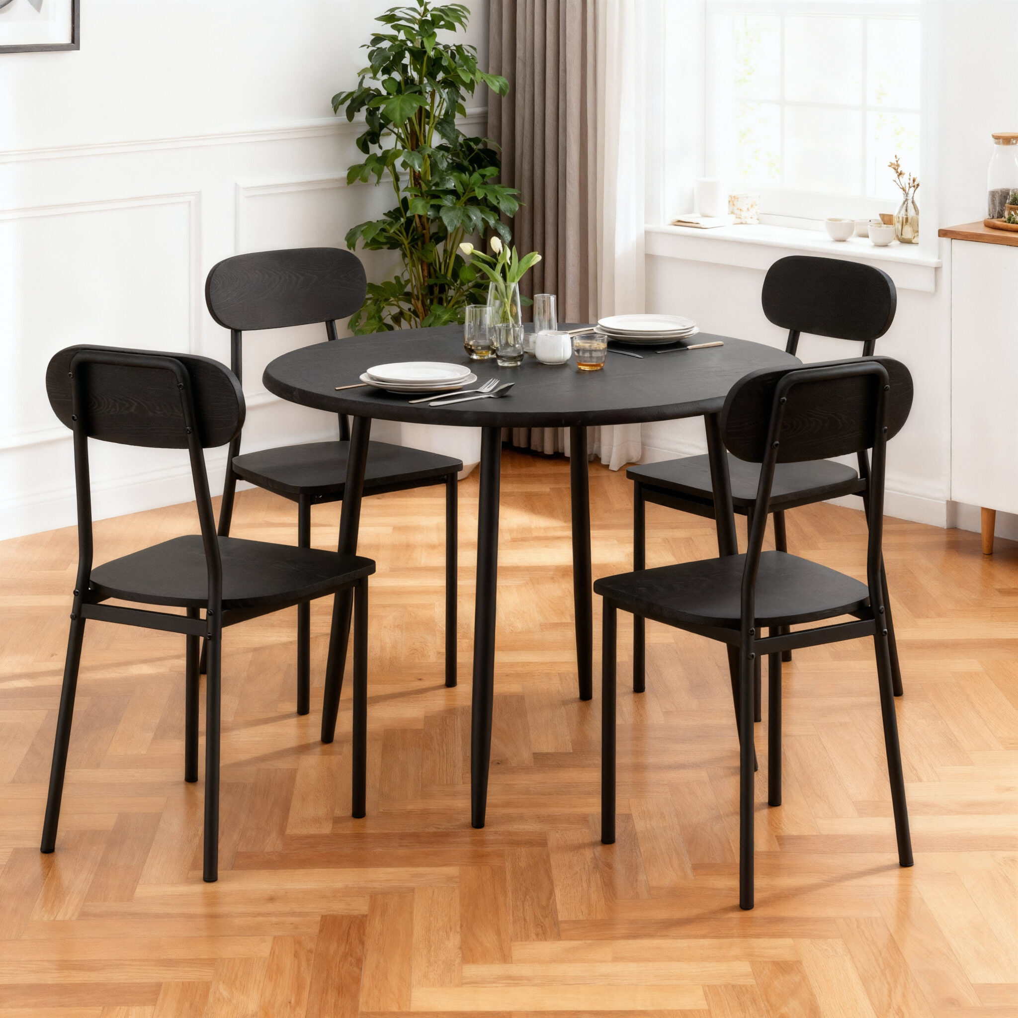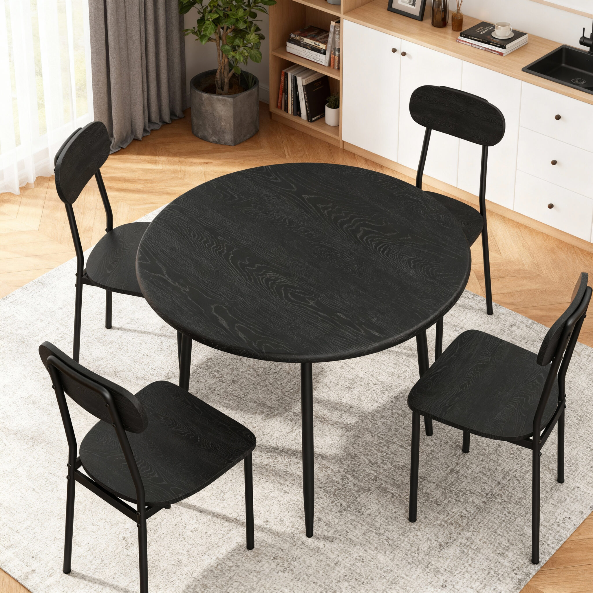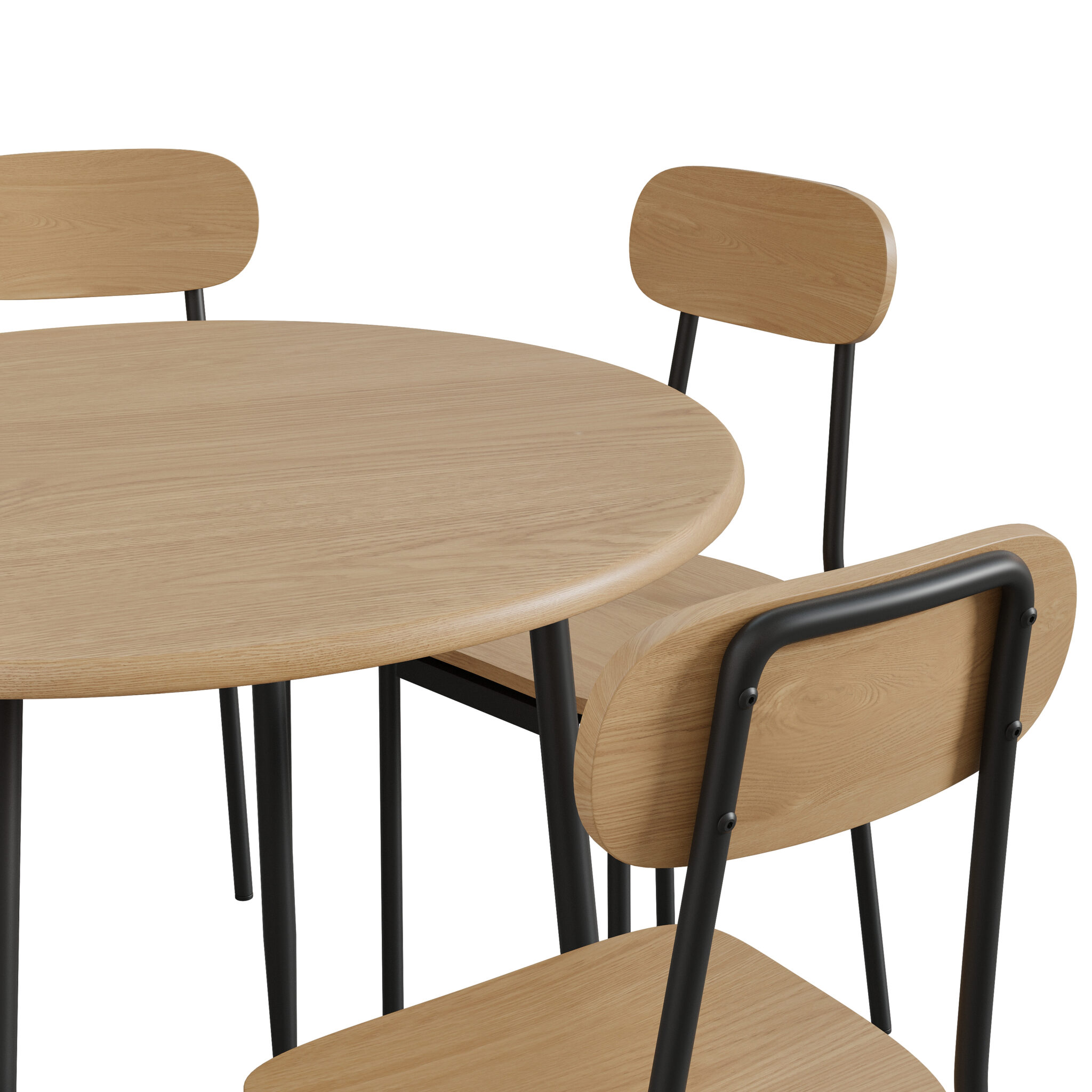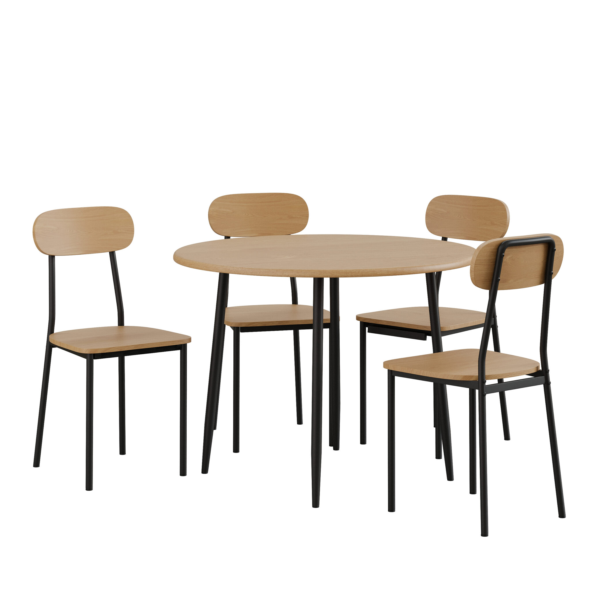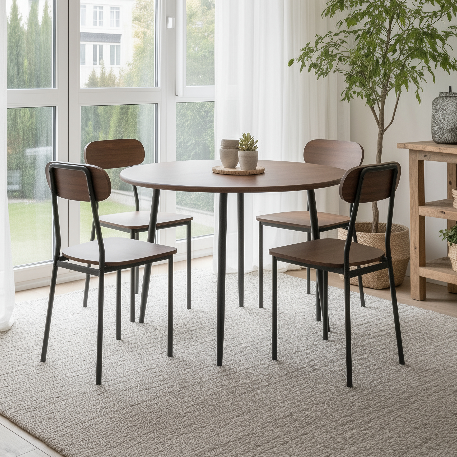 פינת אוכל במראה עץ בעלת ארבע רגלי מתכת מושחרת וכסאות תואמים