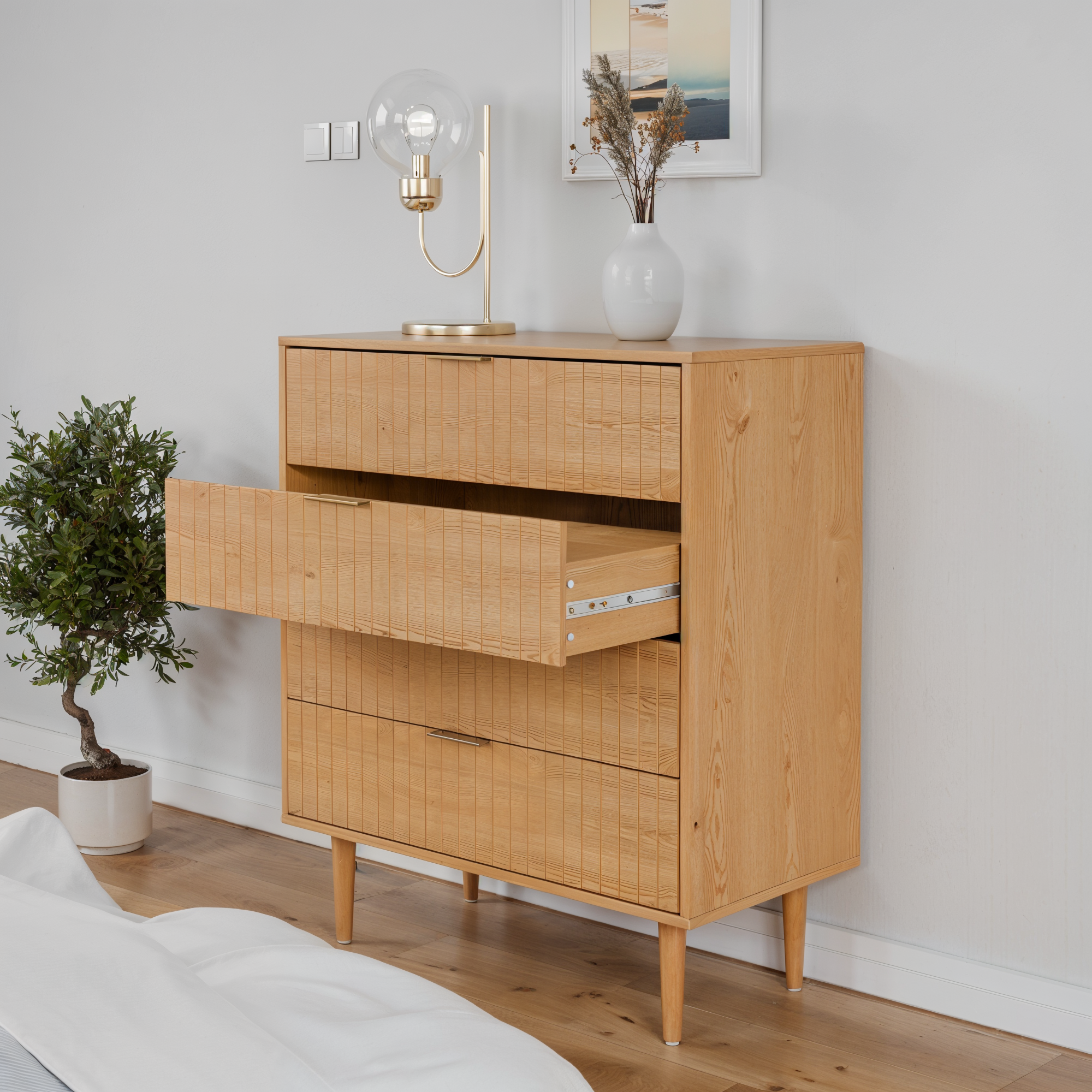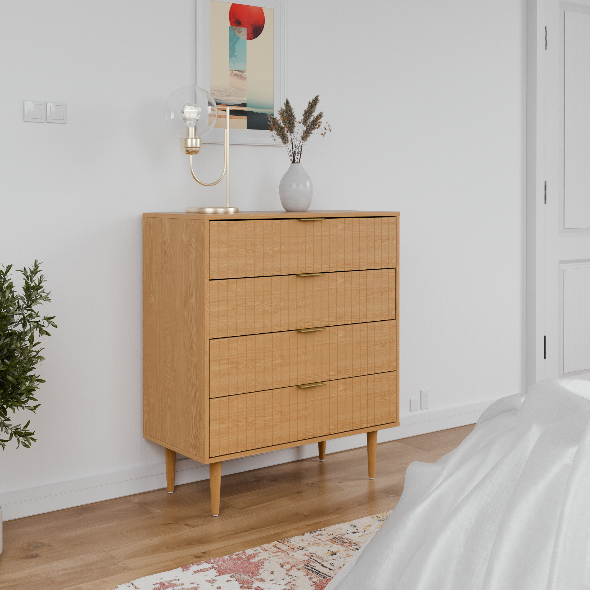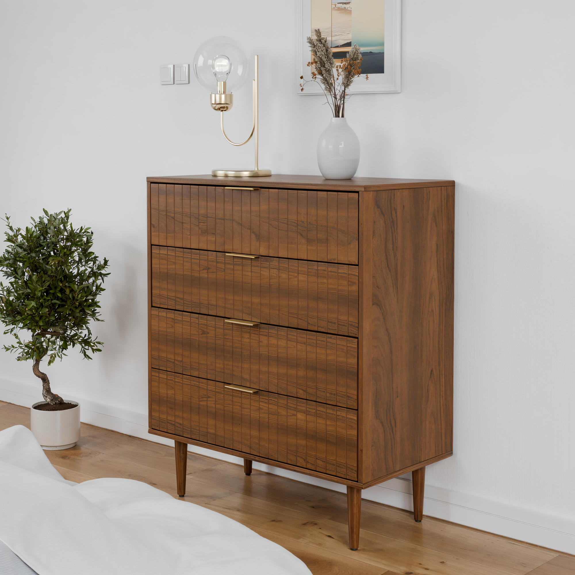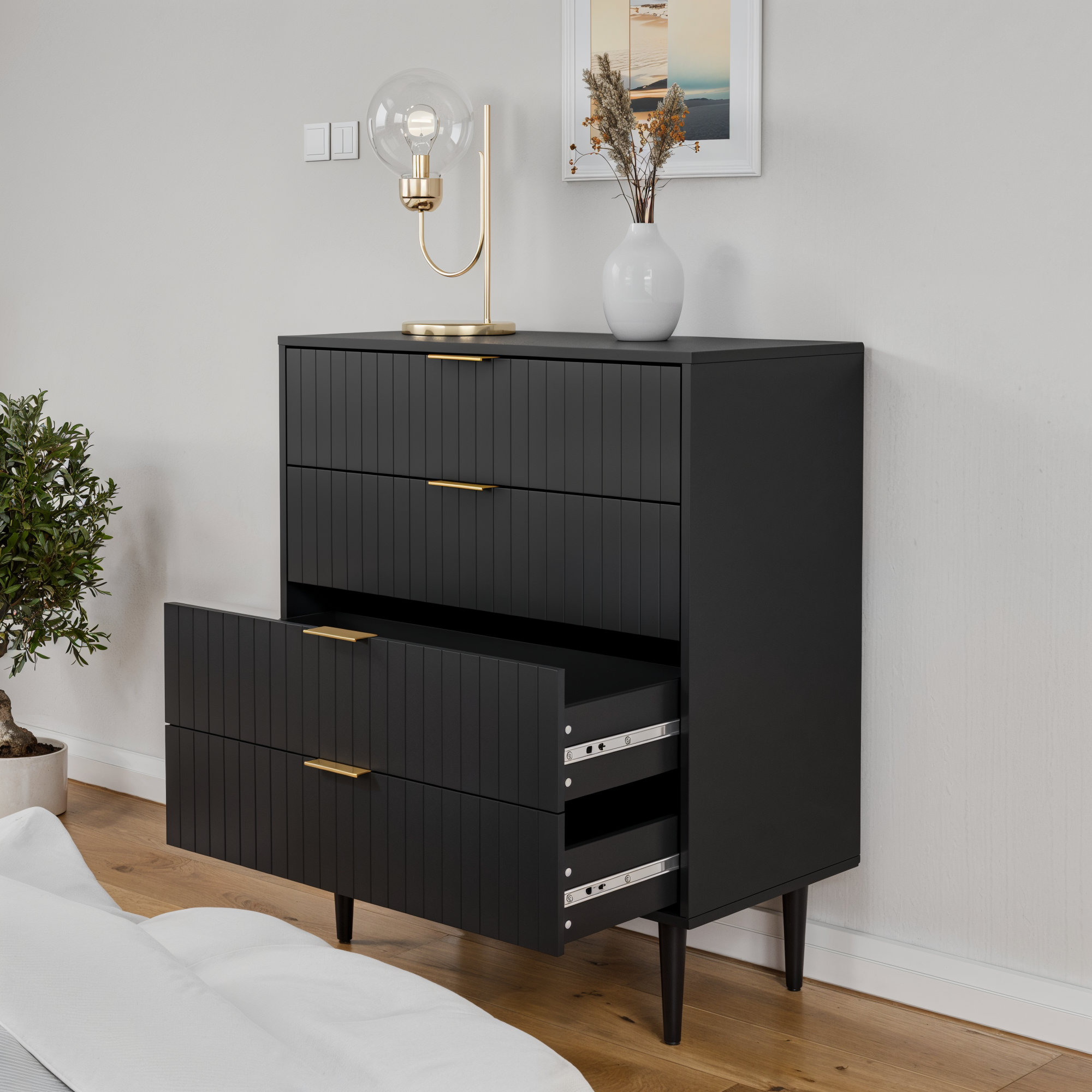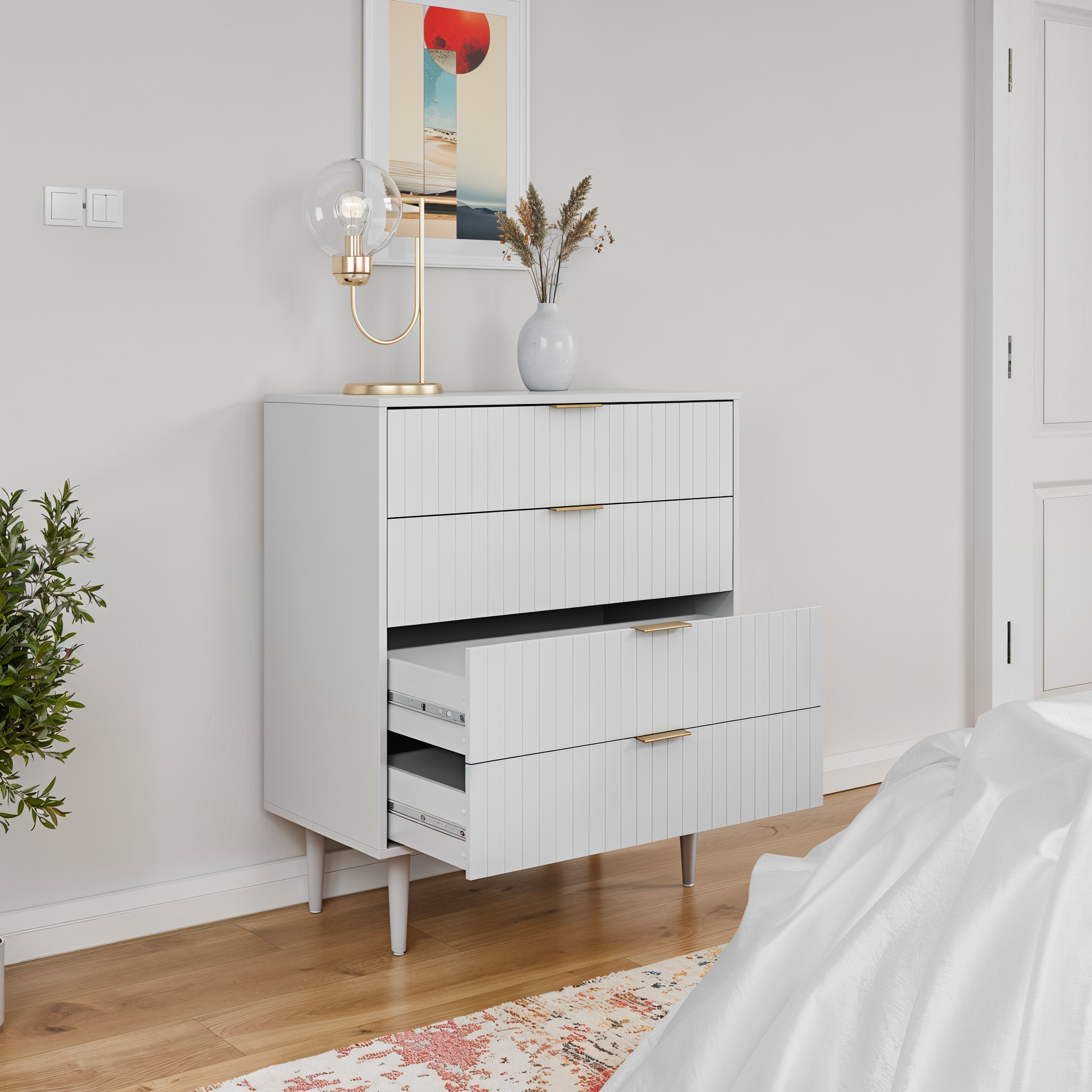 קומודת ארבע מגירות בעיצוב אלגנטי ויוקרתי המתאים לכל חלל עיצוב יוקרתי המשלב פתרון אחסון